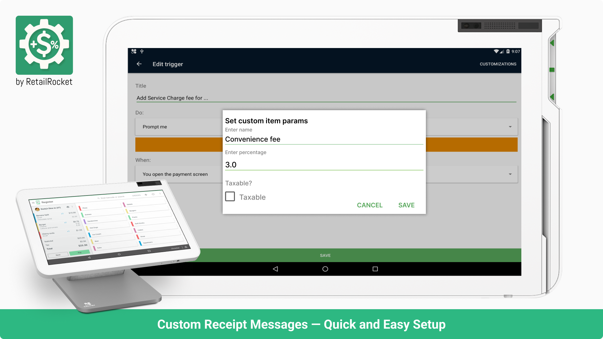 Set custom fee names and show them clearly on receipts with amount and taxable status.