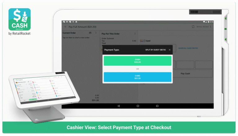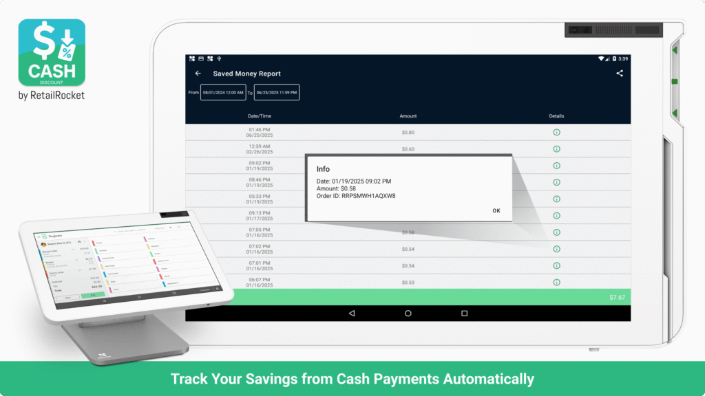 Precheck and final receipts now show both prices — with a simple note encouraging cash payment.