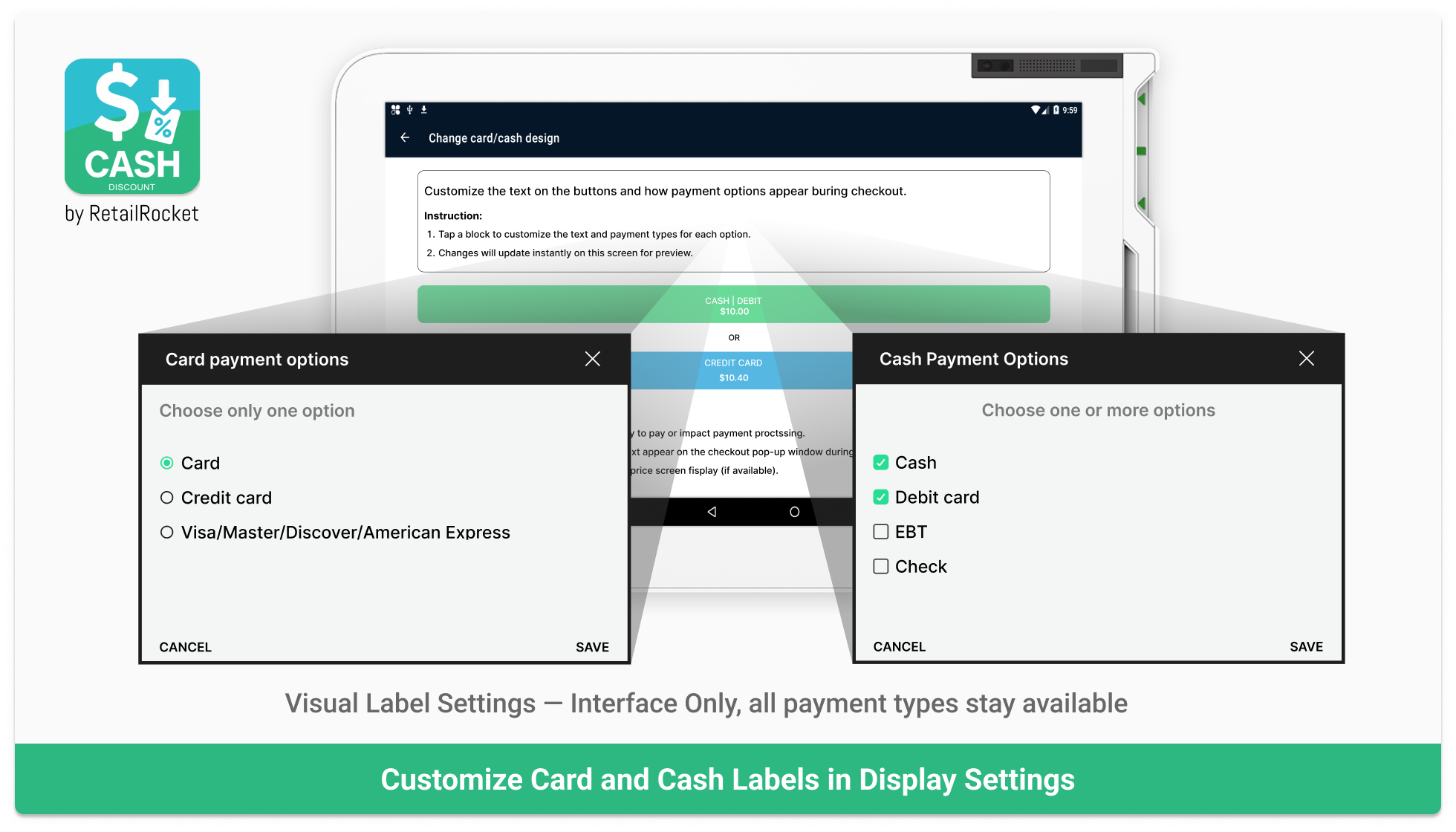 You can adjust payment type labels — show “Credit,” “Debit,” and “Cash,” or simply “Cards” and “Cash”