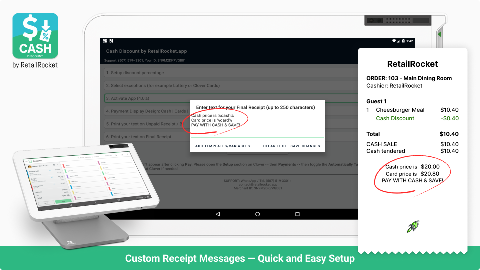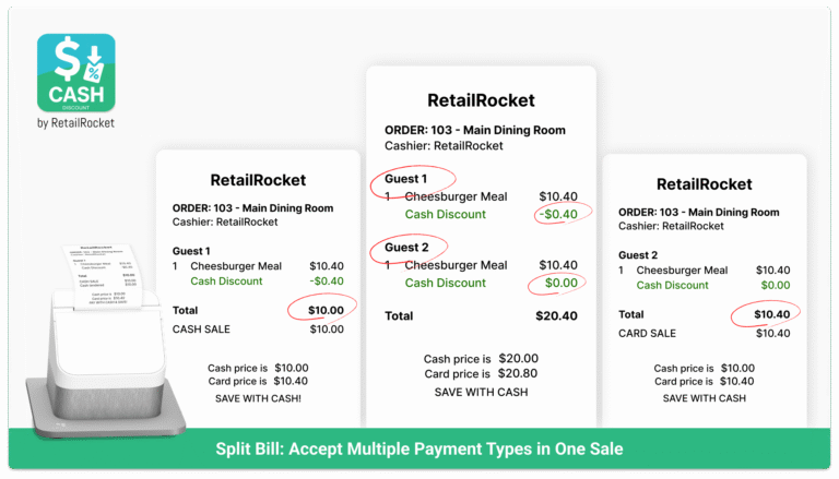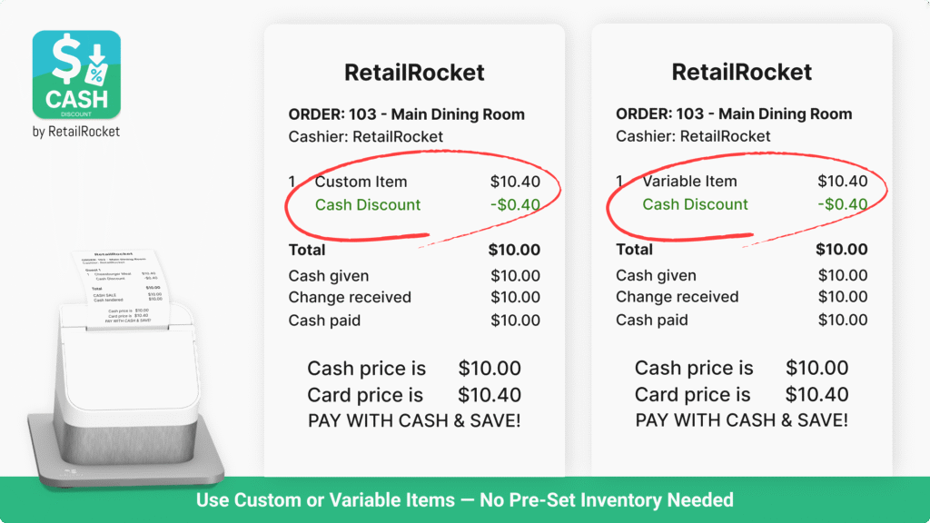 Set up custom receipt messages like “Cash $12.00 / Card $12.42” to make the pricing transparent.