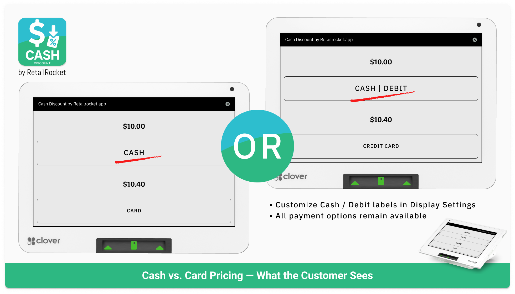 Precheck and final receipts now show both prices — with a simple note encouraging cash payment.