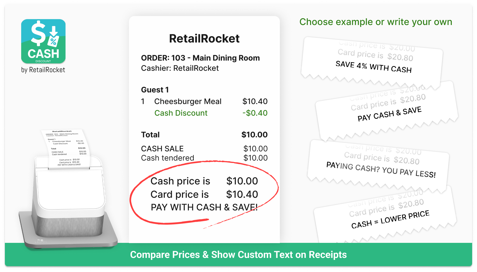 Set up custom receipt messages like “Cash $12.00 / Card $12.42” to make the pricing transparent.